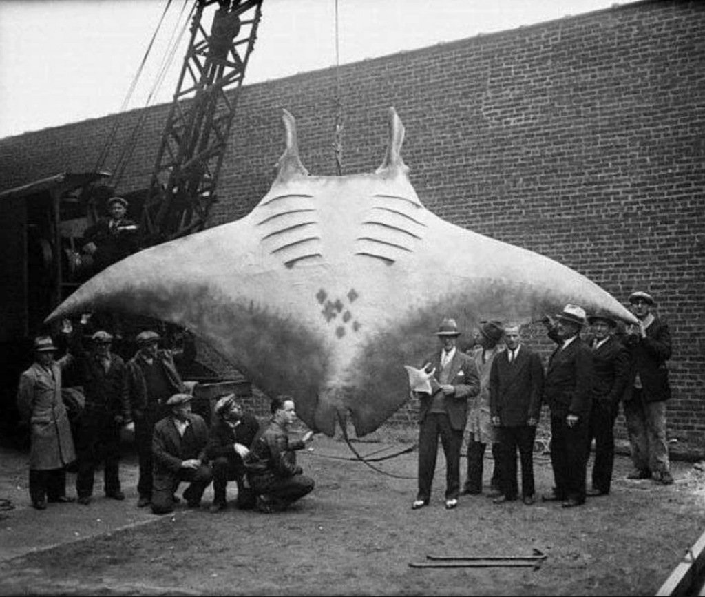 Egy régi fénykép egy óriás óceáni mantarájáról, amelynek szárnyfesztávolsága majdnem eléri a 30 lábat. Az emberek a méretarány érzékeltetésére láthatók.